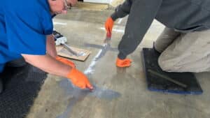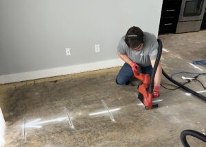 After the chemical grouting was complete, the concrete slab was prepped for stitching. Using a Hilti DCH 230 electric cutter and HEPA vacuum, 1” deep by 1/8” wide slots were cut into the slab. A total of 37 Crack Stitches were installed across all visible cracks in the concrete to provide long-term structural reinforcement.