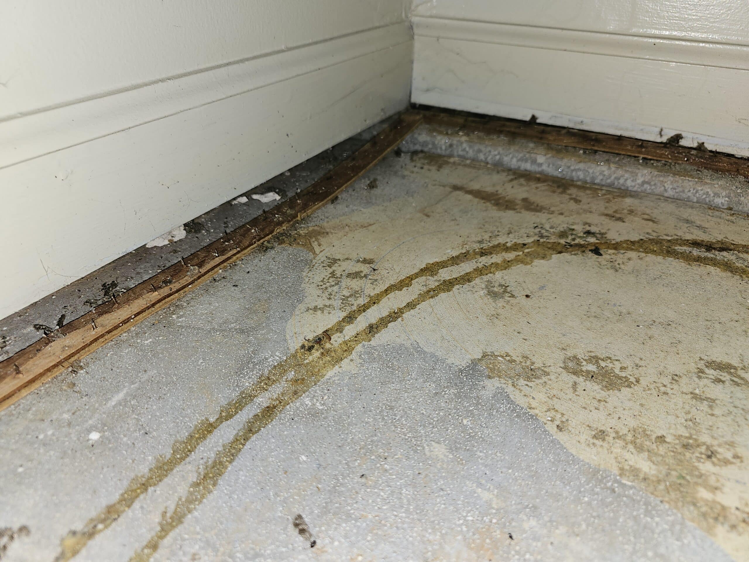 A two-story apartment building in Clarksville, Tennessee experienced over 1.5 inches of vertical settlement in its floating concrete slab floor. The movement caused a noticeable crack across the floor and visible gaps under exterior walls and baseboards, raising concerns about structural integrity and tenant safety.